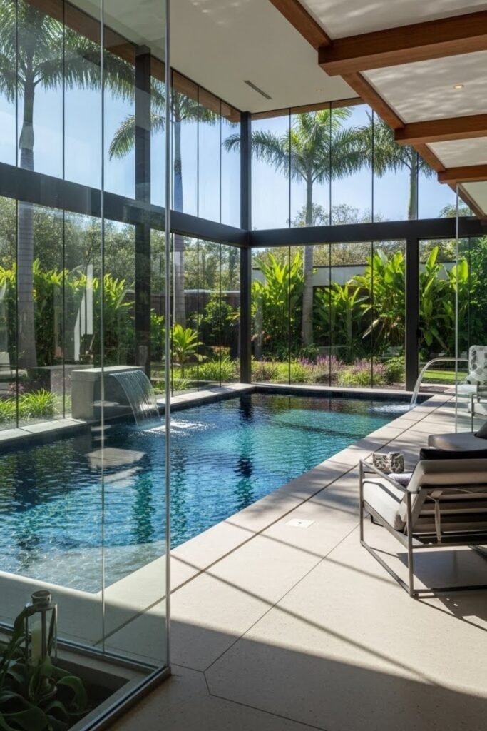 This glass house features an indoor pool surrounded by transparent walls. Natural light reflects off the water, creating a calm, spa-like atmosphere. The glass enclosure keeps the space visually open while allowing year-round use.