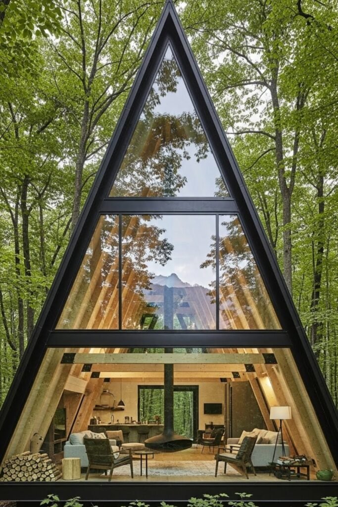 This design works well in forests, mountains, or lakesides, offering a modern twist on a timeless structure.