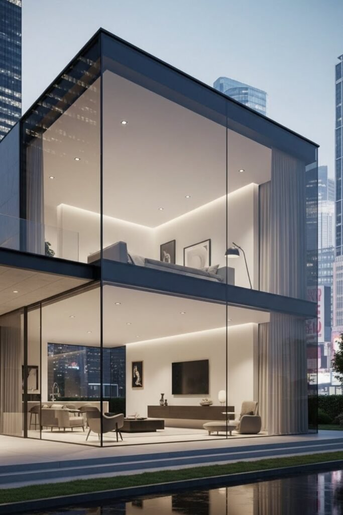 An urban compact glass house is designed for narrow or limited city plots. Vertical layouts and glass walls help maximize light in dense surroundings.
