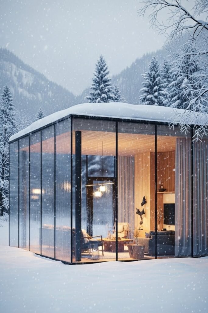 A snow-ready glass house is designed for cold climates while still embracing transparency. High-performance insulated glass keeps interiors warm while showcasing snowy landscapes outside.