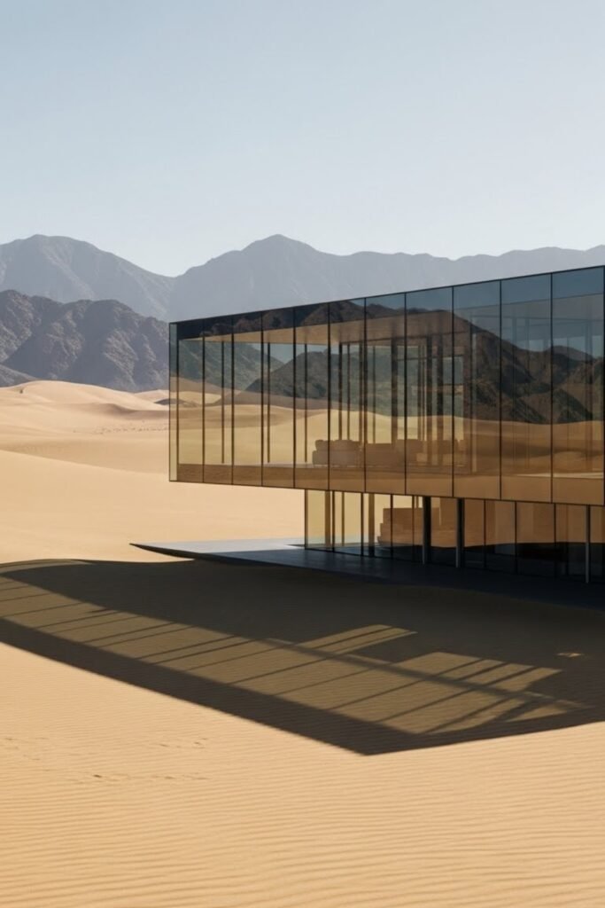 The contrast between transparent walls and harsh surroundings creates a striking balance of comfort, efficiency, and modern desert architecture.