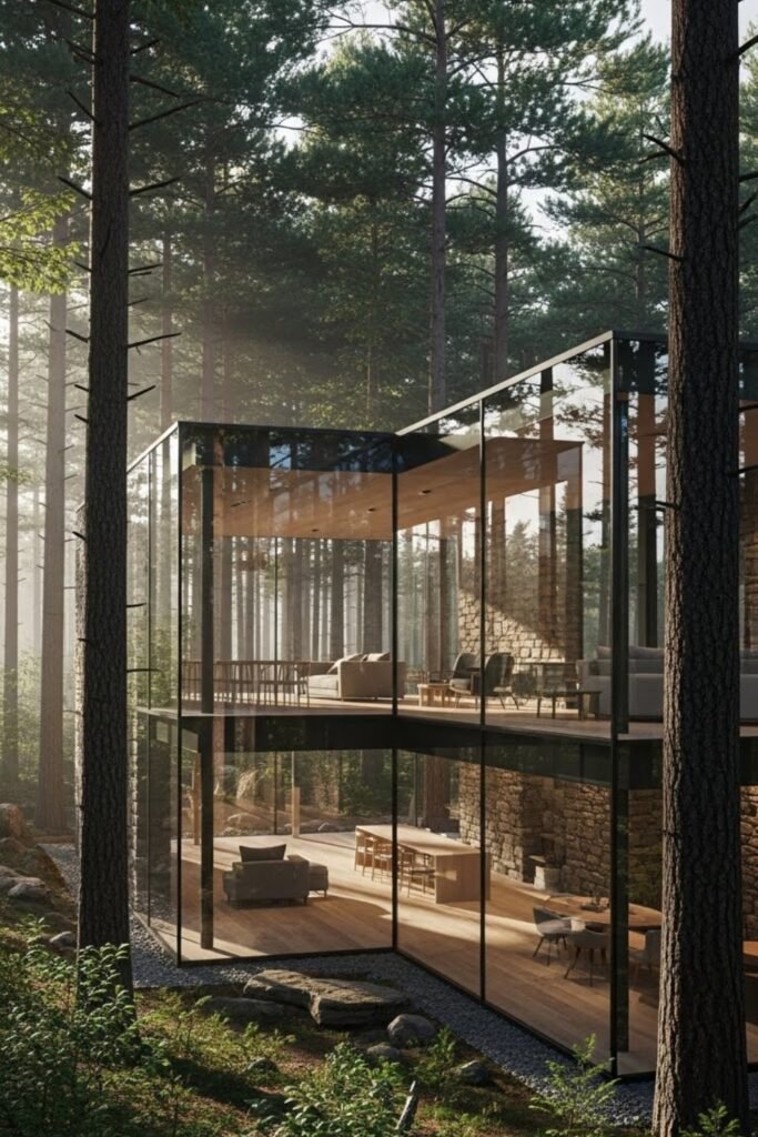 This glass house is designed to blend into a forest environment. Floor-to-ceiling glass walls surround the living areas, allowing trees, sunlight, and changing seasons to feel part of the interior.