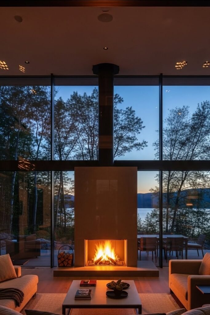 This idea works especially well in cooler climates, where the glow of the fire contrasts beautifully with open views and glass surfaces.