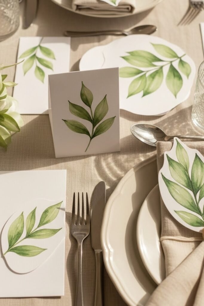 Use hand-painted leaf elements across tables, signage, and favors for a personal touch. This works beautifully for intimate baby showers where DIY details matter.