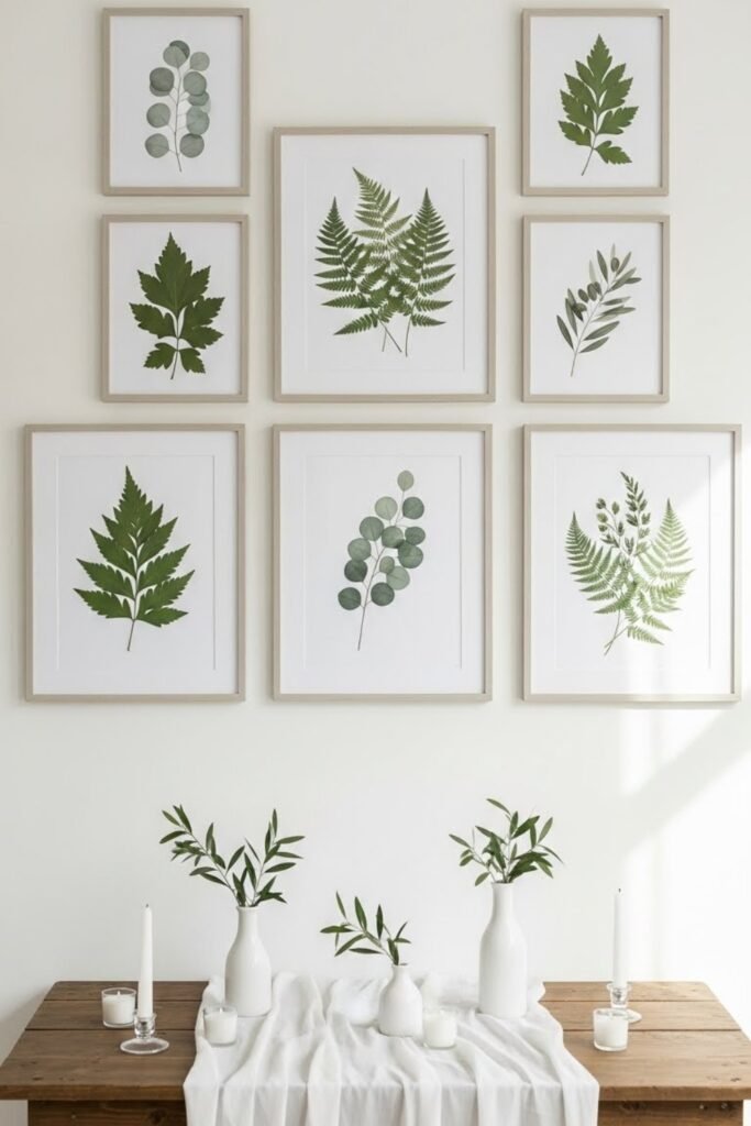 Incorporate framed green elements such as pressed leaves, minimalist prints, or soft illustrations displayed throughout the space.