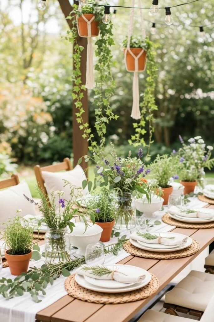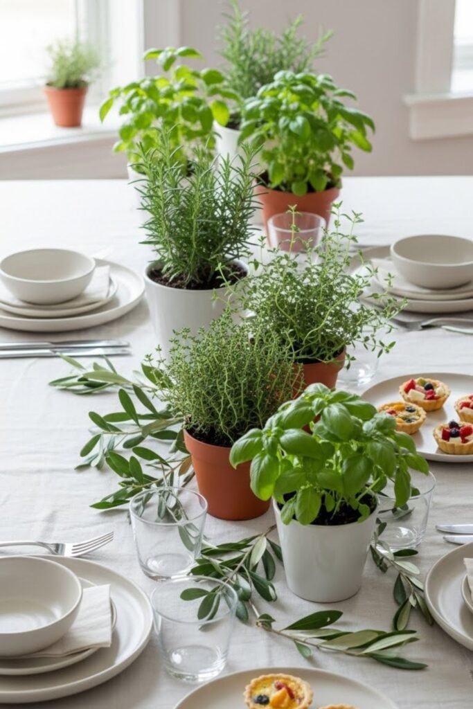 Use herbs as décor elements rather than flowers. Small herb pots, subtle leaf accents, or herb-inspired table styling make this idea fresh and unexpected.