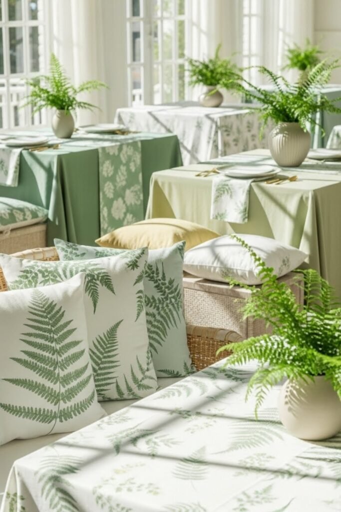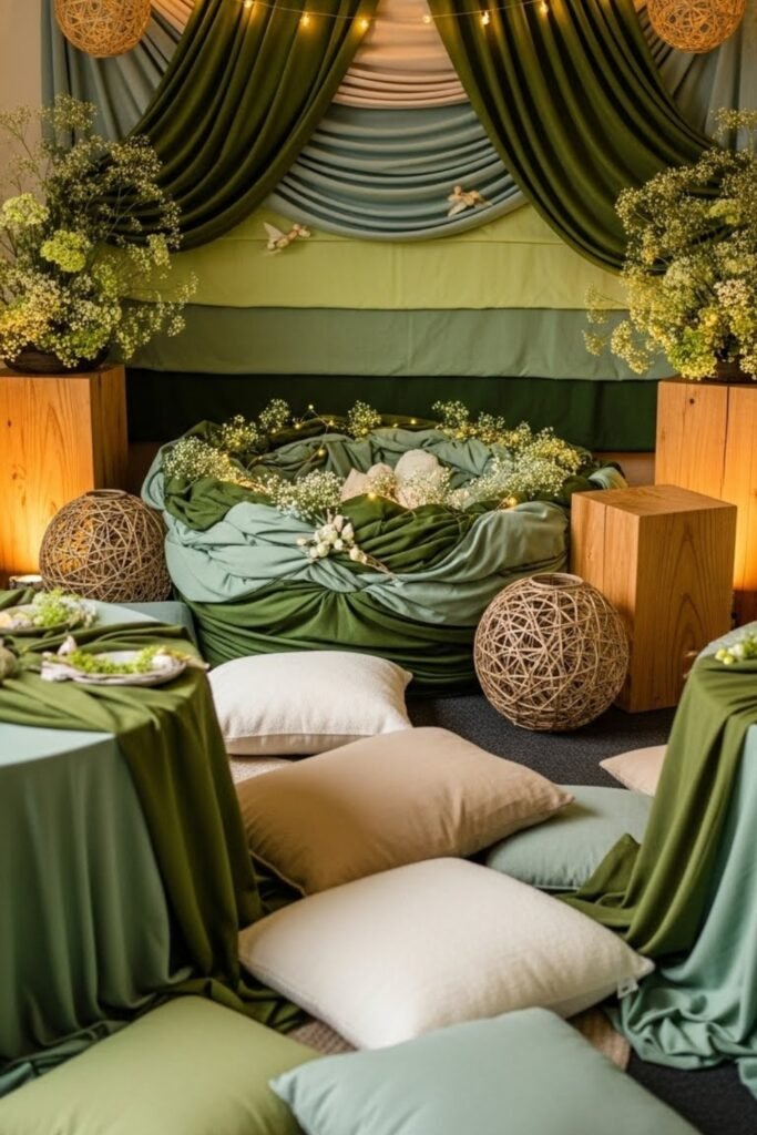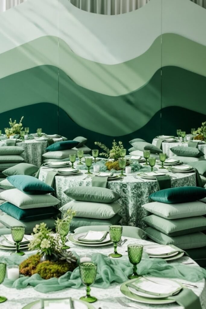 Layer different shades of green through fabrics, table settings, and soft décor instead of patterns. This creates depth while keeping the setup visually calm.