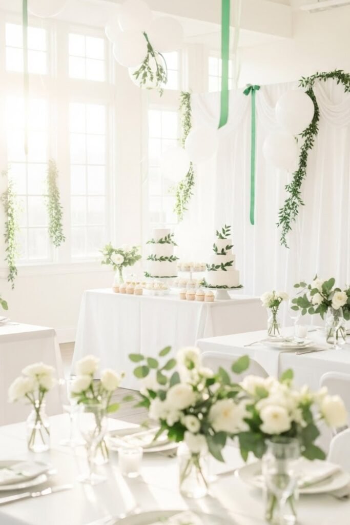 This works beautifully for airy venues with natural light. Pair light green accents with neutral seating to keep the look elegant, organic, and different from typical greenery-heavy baby showers.