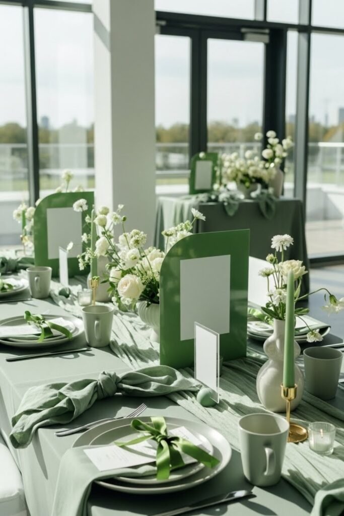 Focus on balance by repeating the same green shade across décor, stationery, and table elements. This creates a cohesive look without adding extra items.