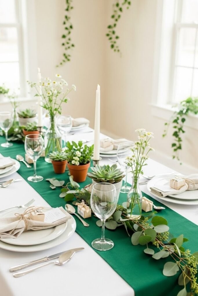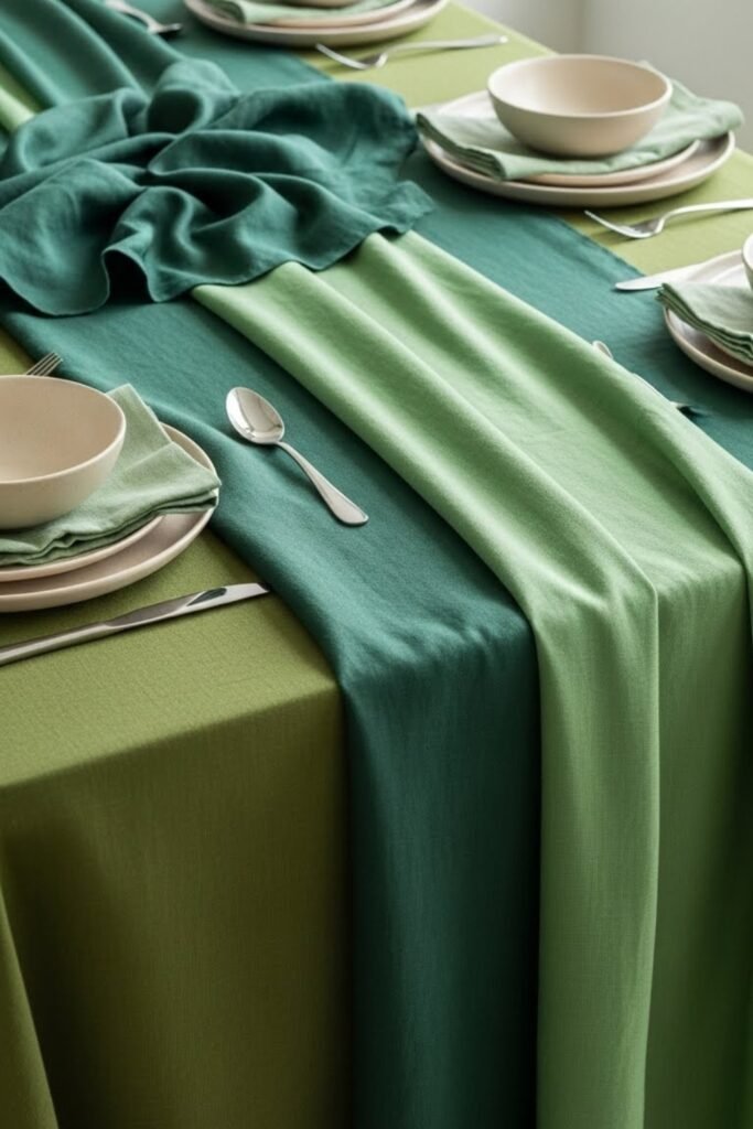 Build the theme through layered green linens instead of décor pieces. Use tablecloths, runners, and napkins in varied green shades to add depth.