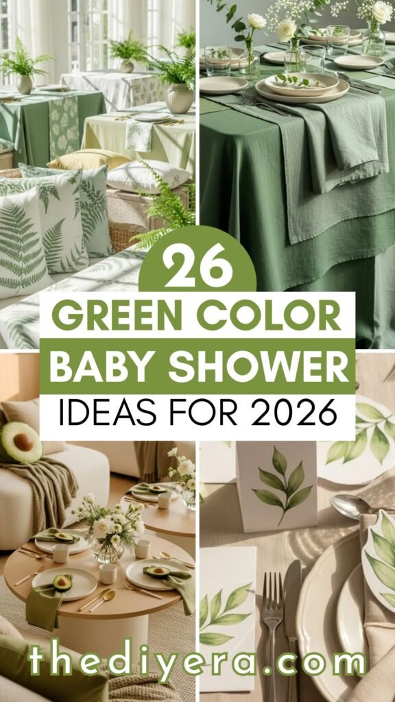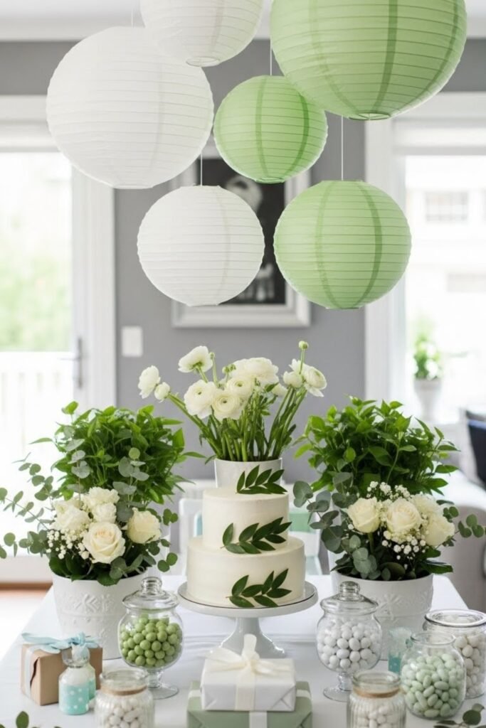 This idea adds depth without clutter and feels very modern. It’s perfect for hosts who want a stylish green baby shower without relying on florals or themed graphics.