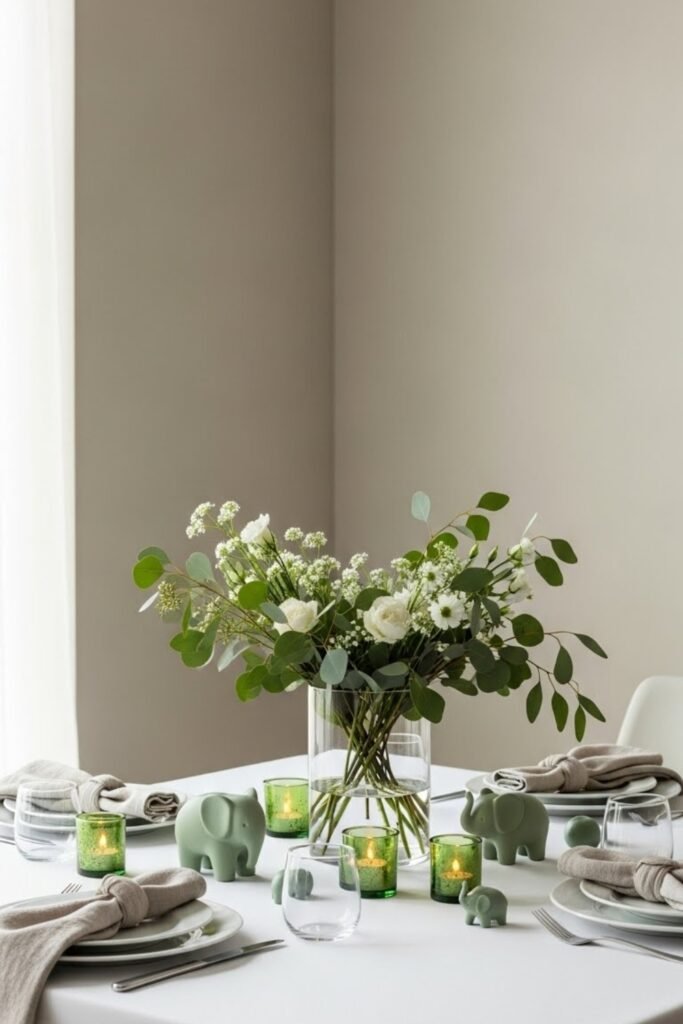 Center the baby shower around one beautifully styled table using green as the anchor. Focus on layered table styling—green runners, simple centerpieces, and coordinated place settings—while keeping the rest of the space minimal.