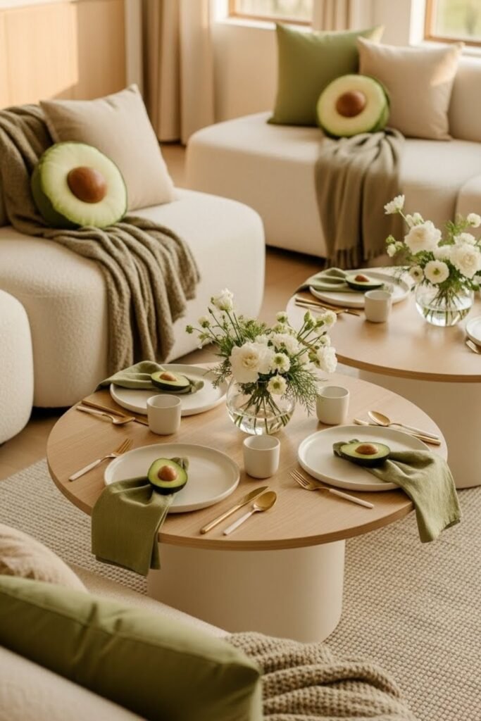Build a playful yet elegant setup using avocado-toned greens paired with cream and light wood accents. Avoid cartoon styling—keep it mature with soft fabrics, rounded shapes, and neutral tableware.