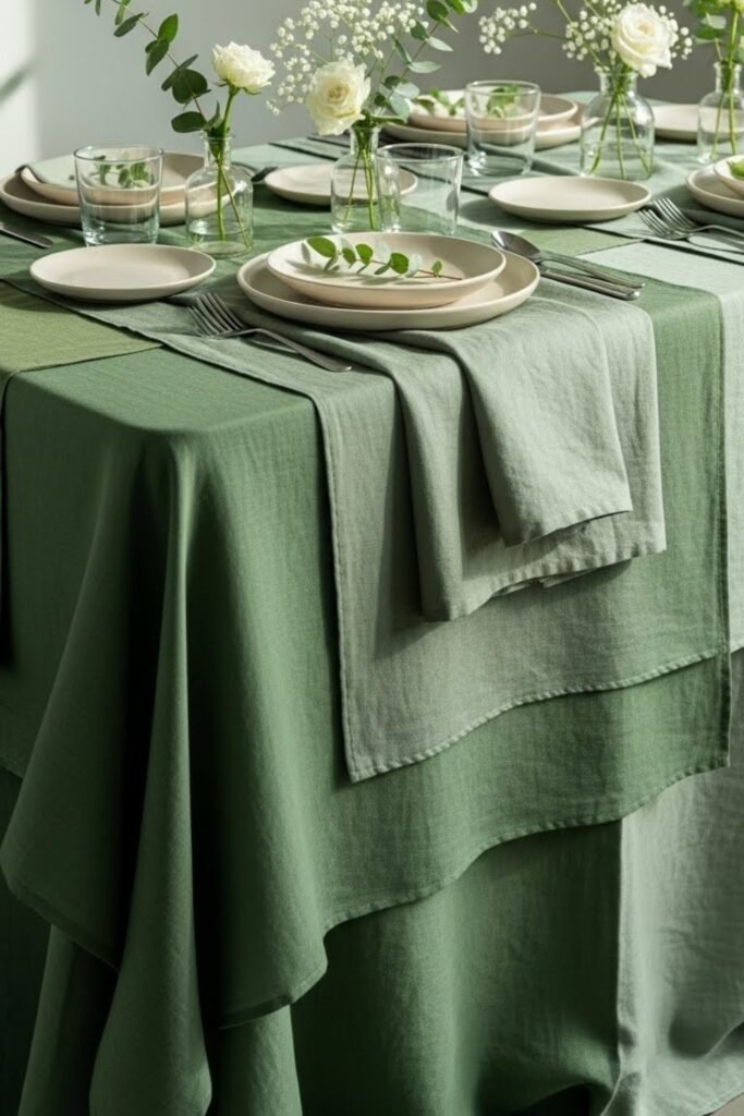 Use soft green linens as the main design feature instead of heavy décor. Tablecloths, runners, and napkins in layered green tones create a calm, upscale look.