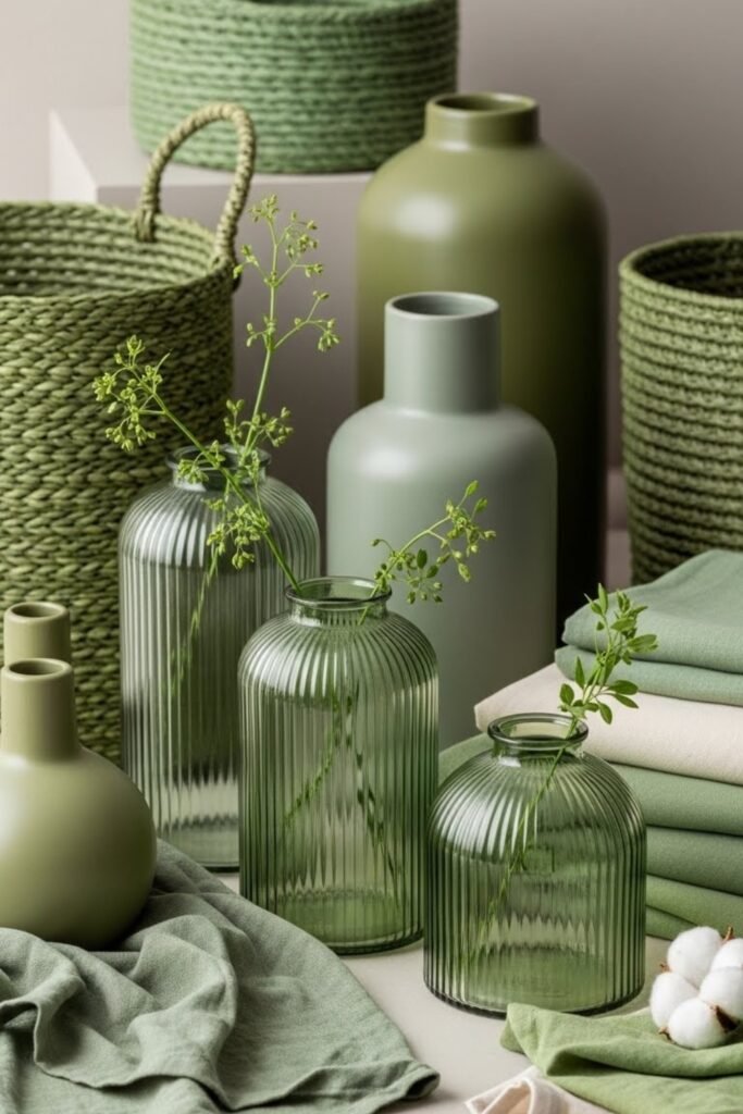 Instead of patterns or prints, focus on texture. Combine matte ceramics, ribbed glass, woven baskets, and soft fabrics in green shades.