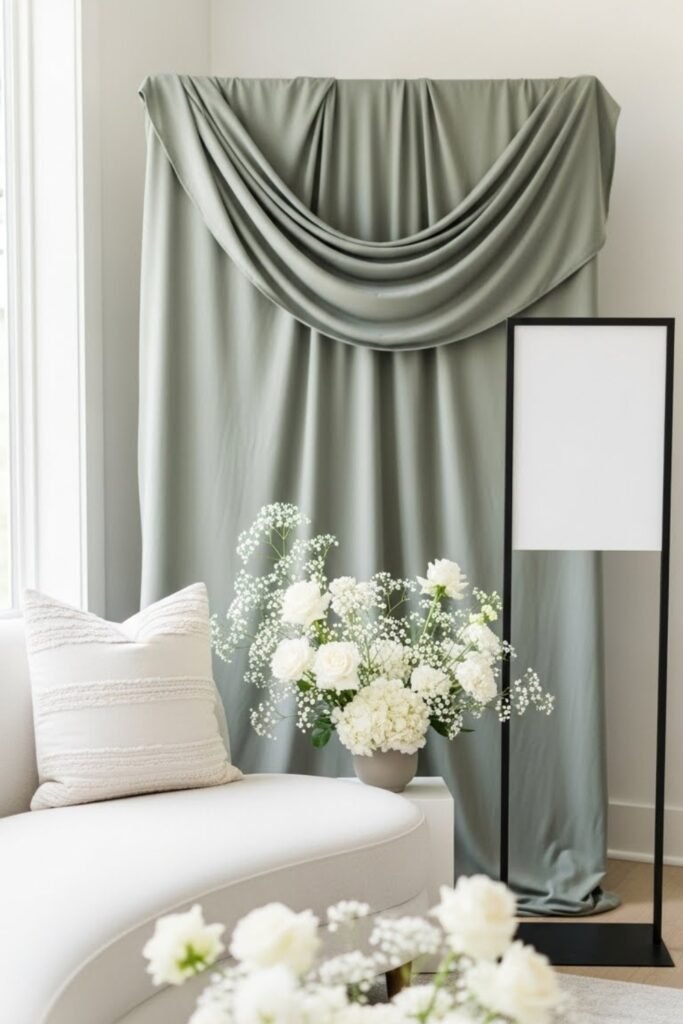 Create a soft, artistic setup using muted green backdrops, painted arches, or fabric panels instead of printed themes. This idea works well for modern homes or indoor venues.