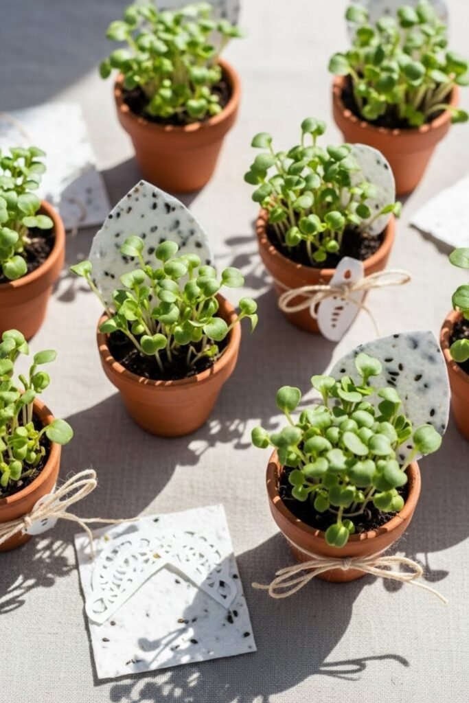 Build the theme around new growth using sprout-inspired details rather than flowers. Think small green accents, seed-paper stationery, or subtle plant motifs.