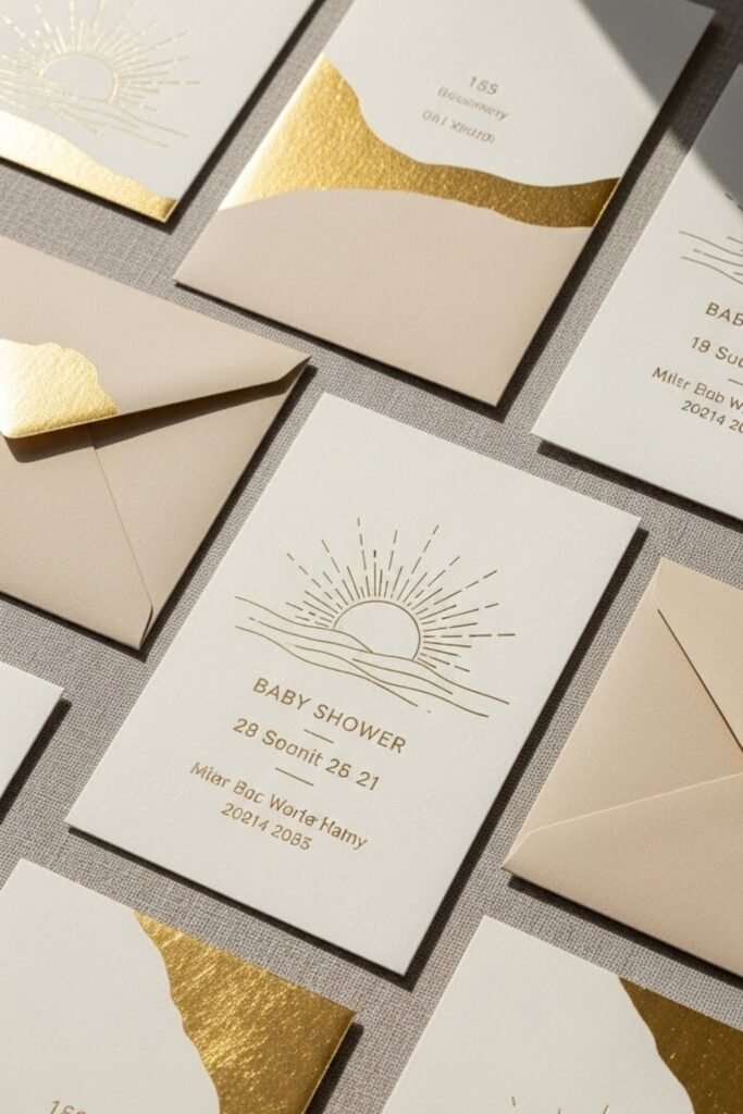 Design invitations using warm neutral backgrounds, subtle sun illustrations, and elegant gold accents. Keep the layout clean and modern so the theme feels stylish, not childish.