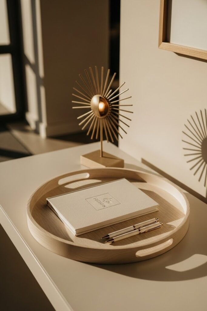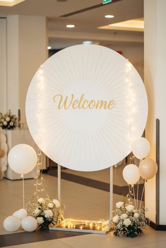 Place a styled tray at the entrance with a guest book, pens, and a small sun-themed sign. Keep the colors warm and neutral so it blends with the rest of the décor.