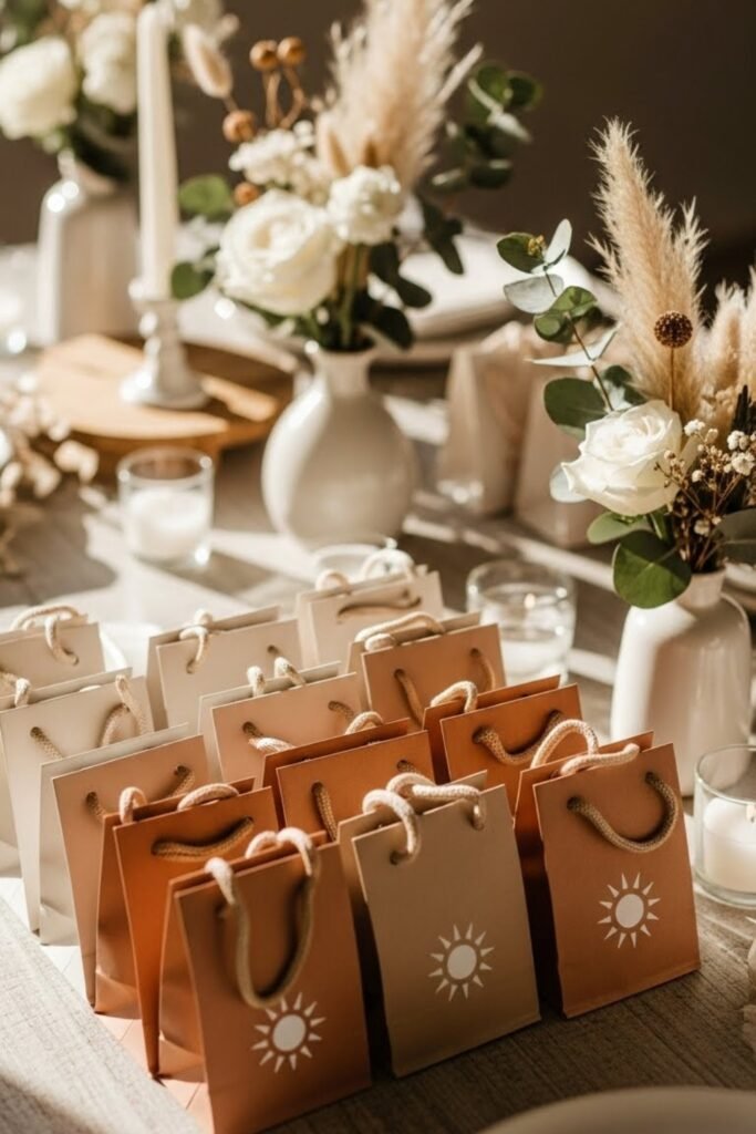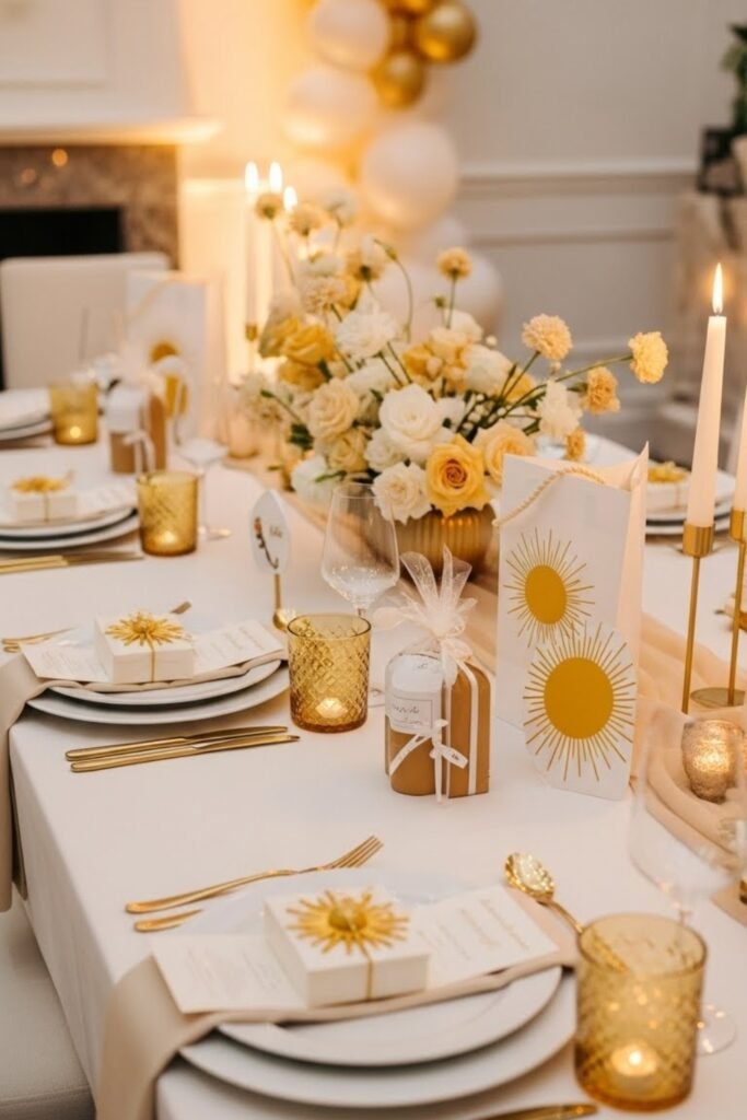 Offer small keepsakes featuring subtle sun details, such as tags, charms, or printed icons on favor bags. Keep the colors neutral with a hint of yellow so the favors feel stylish rather than themed.