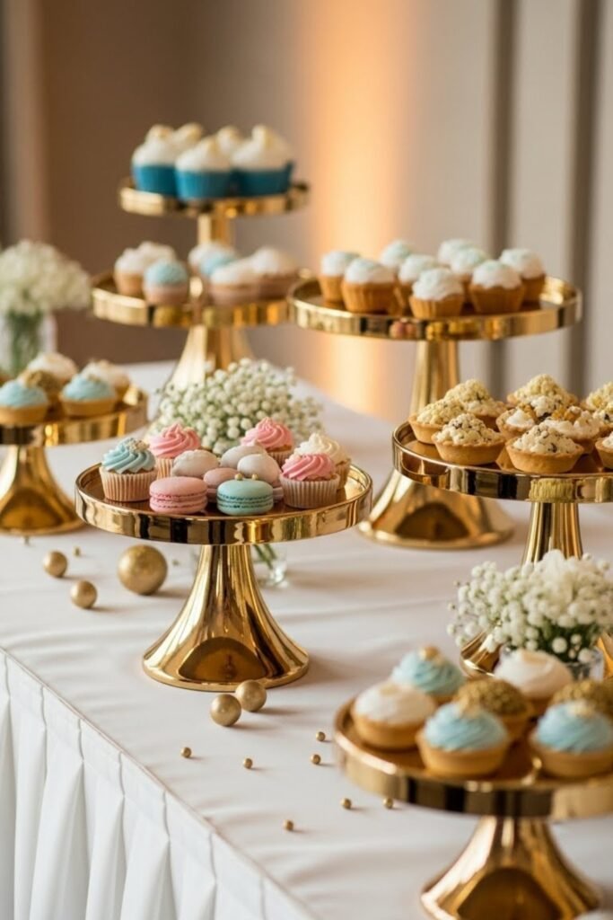Use gold or brass-tiered stands to display desserts, snacks, or treats. The metallic finish reflects light beautifully and reinforces the warm theme without needing extra decoration.