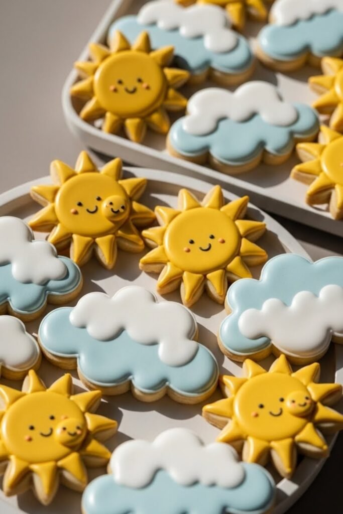 Serve custom cookies shaped like simple suns, clouds, or rays with minimal detailing. Stick to soft icing colors to keep the look modern.