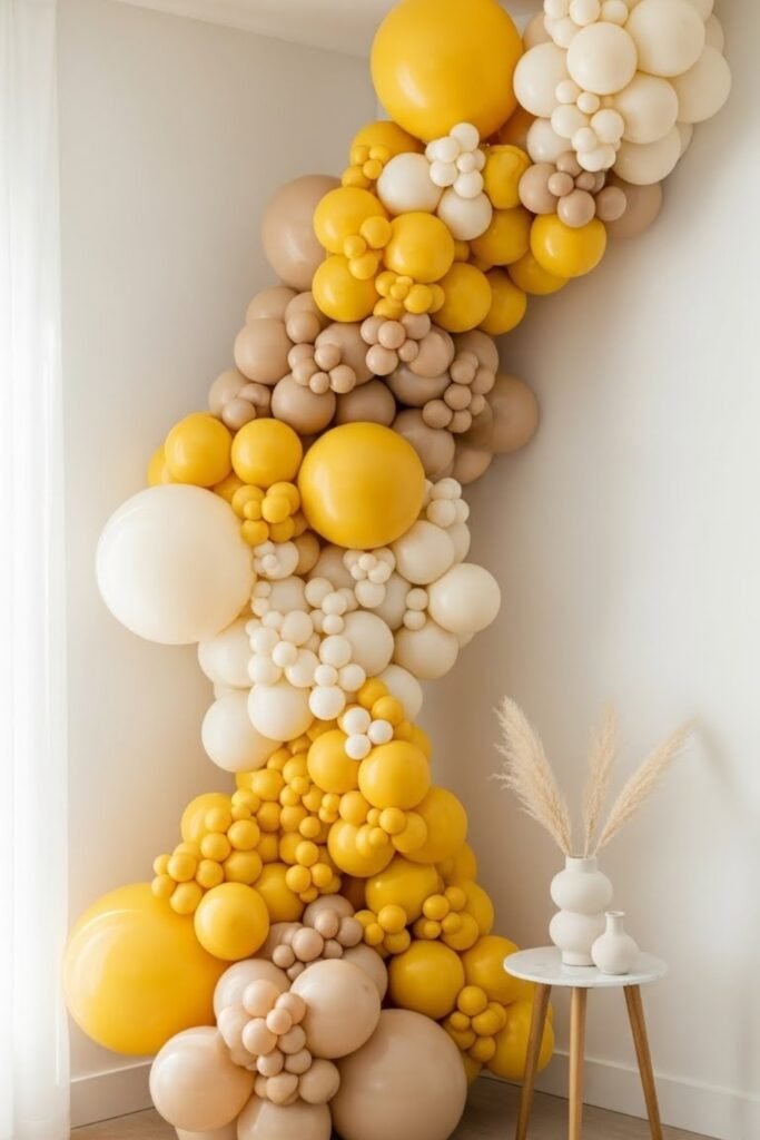Create organic balloon clusters using matte yellow, cream, and beige tones. Keep the sizes varied and avoid metallic finishes for a softer look.
