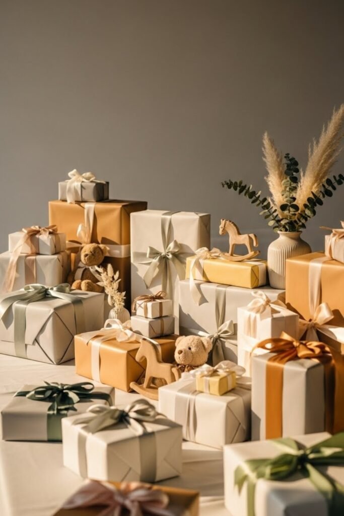 Style the gift table with warm tones, soft lighting, and minimal sun details. Use a neutral backdrop and gentle lighting so the area feels intentional and inviting.