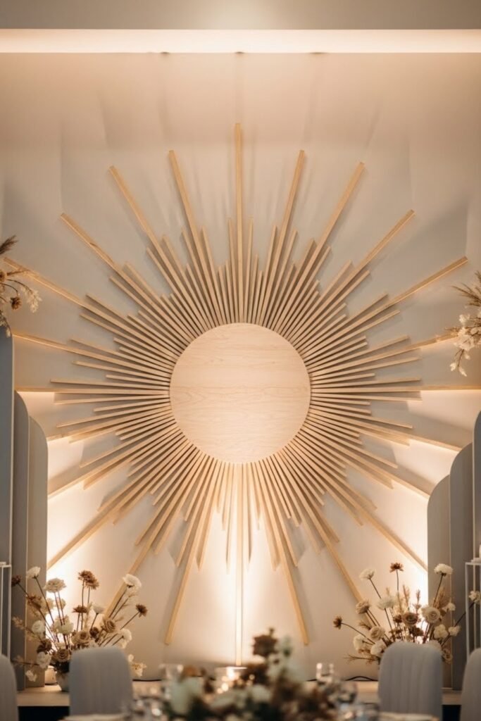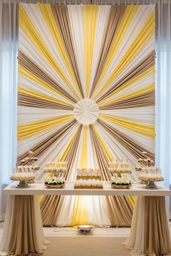 Use layered fabric panels arranged outward like sun rays to create a stunning photo backdrop. Stick to soft yellows, ivory, and light beige for a calm, glowing look.