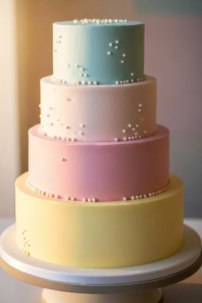 Design a simple cake featuring soft color gradients inspired by a sunrise. Avoid heavy toppers and let the colors do the work.