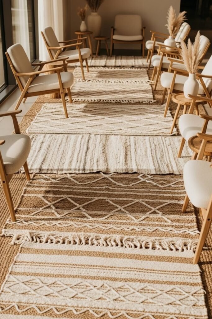 Layer neutral woven rugs under seating or lounge areas to add warmth and texture. Choose beige or light tan tones so they don’t compete with the décor.