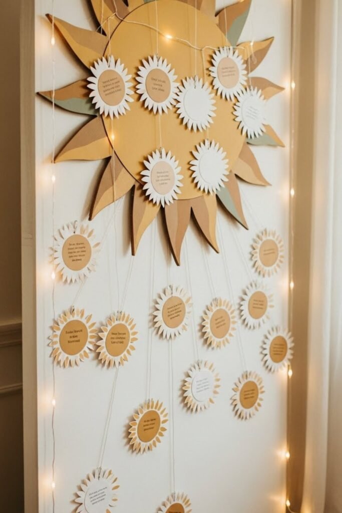 Invite guests to write messages on small sun-shaped cards and display them on a board or string line. Keep the design simple so the focus stays on the messages.