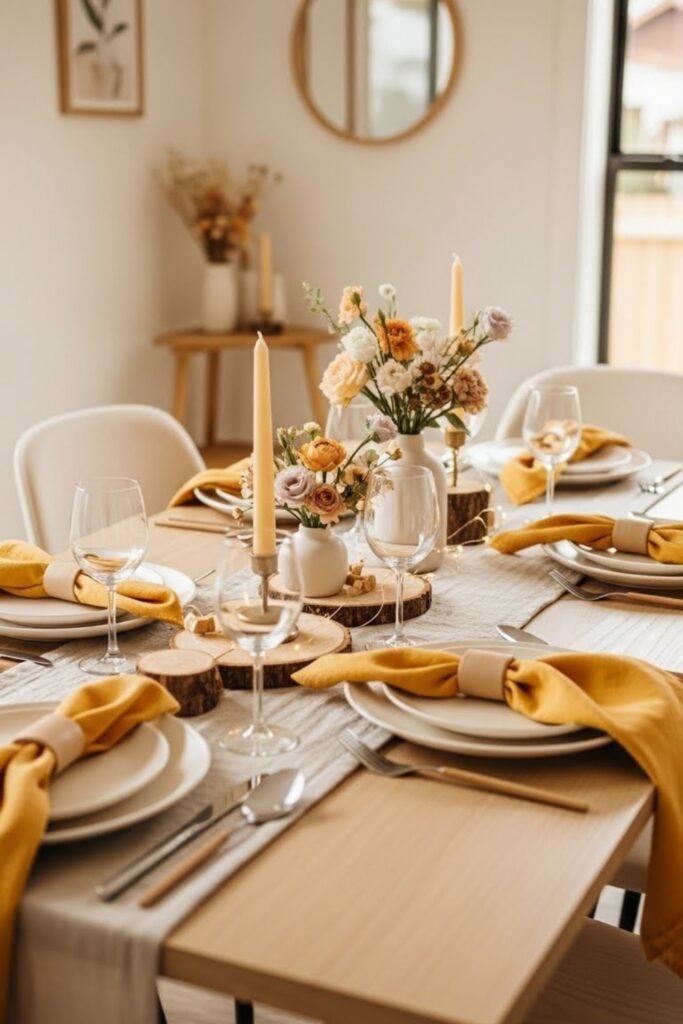 Choose fresh flowers in warm yellow shades and pair them with neutral vases or jars. Keep arrangements low so they don’t block conversation.