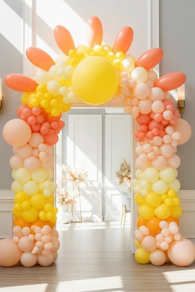 Create a welcoming entrance using an organic balloon arch in soft yellow, peach, and cream shades. Shape it like a rising sun to instantly set the “Here Comes The Son” mood.