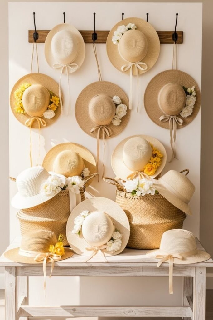 Set up a small display of light-colored sun hats as both décor and optional photo props. Arrange them on hooks, baskets, or a wall rack to keep the setup clean.