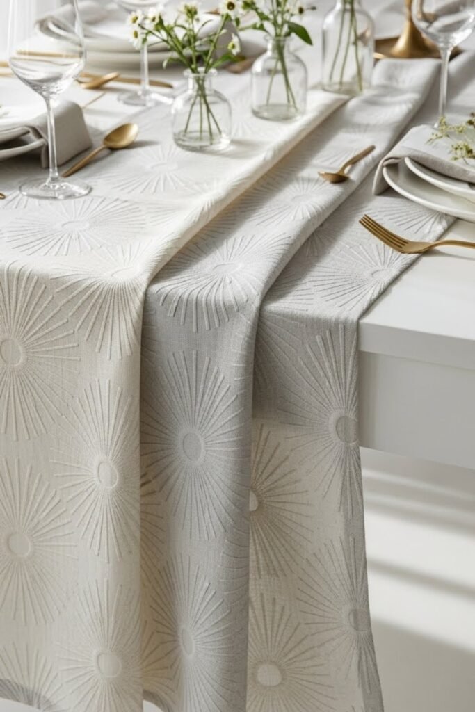Use table runners or cloths with subtle radial or sunburst textures instead of bold prints. Stick to soft neutrals or muted yellow tones so the look feels elevated.