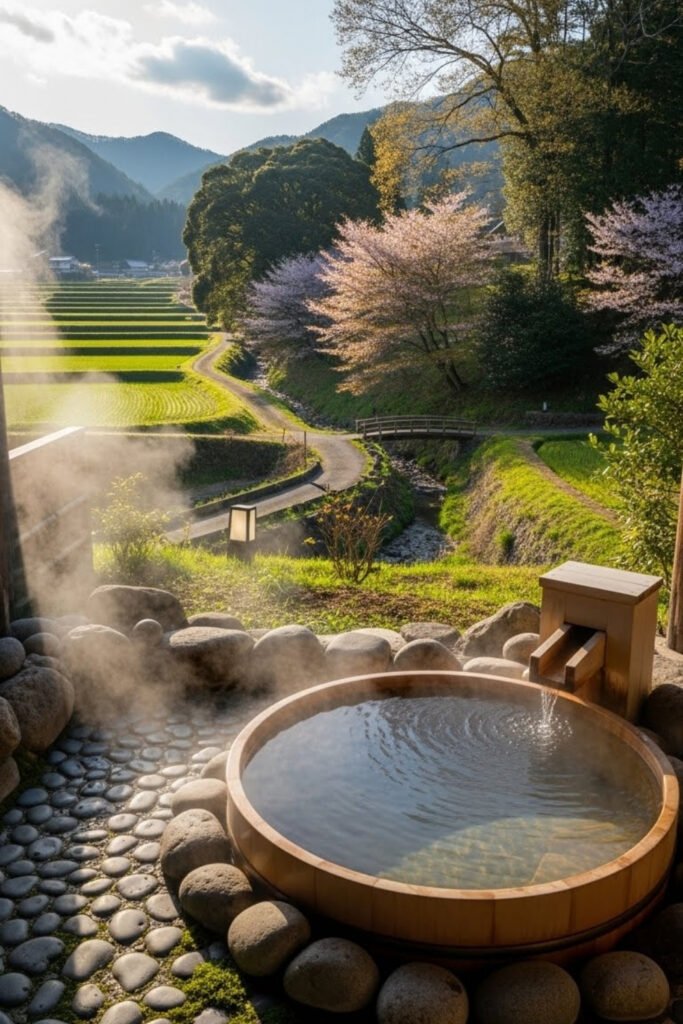 This countryside house is designed around a private outdoor bath facing nature. The bathing area opens toward fields, trees, or hills while remaining screened for privacy.