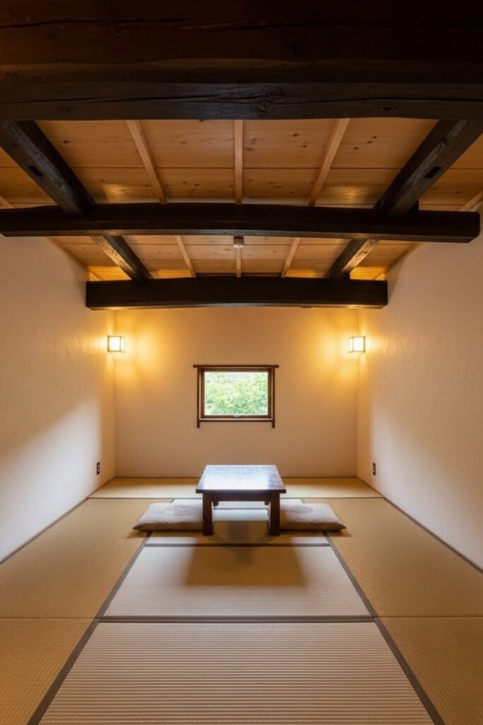 This rural Japanese house uses intentionally low ceilings to create warmth and intimacy. The proportions make rooms feel protected and calm, especially during colder months.
