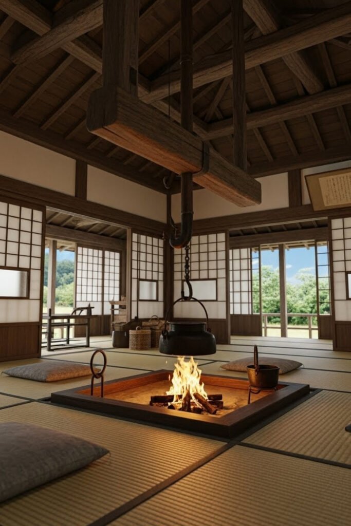 The fire becomes the emotional and functional center of the home, used for warmth, cooking, and gathering. Surrounding rooms stay simple so daily life naturally revolves around this shared space.