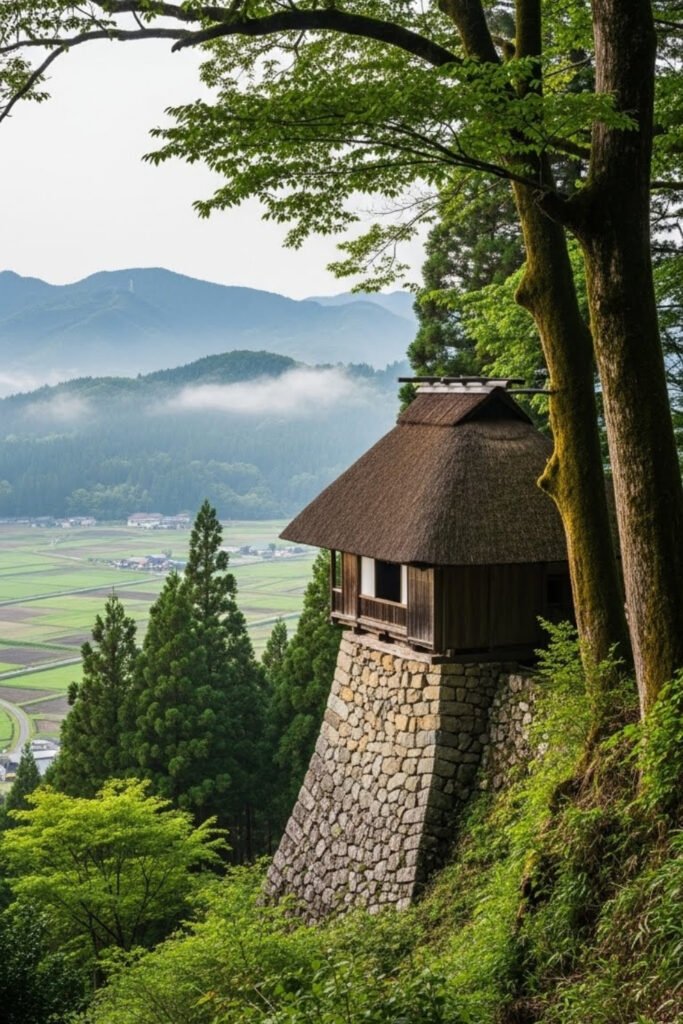 This Japanese countryside house sits where farmland meets wooded hills. Natural wood siding, stone bases, and deep roof overhangs protect the home from mountain weather.