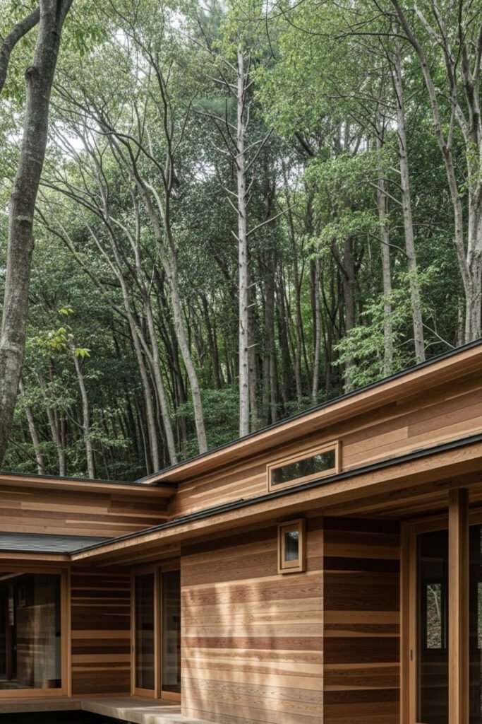 This Japanese countryside house sits in a natural opening surrounded by trees. The layout keeps the structure low and quiet, allowing the forest to feel close without overwhelming the space.