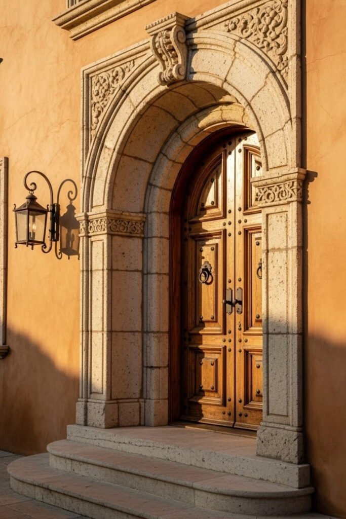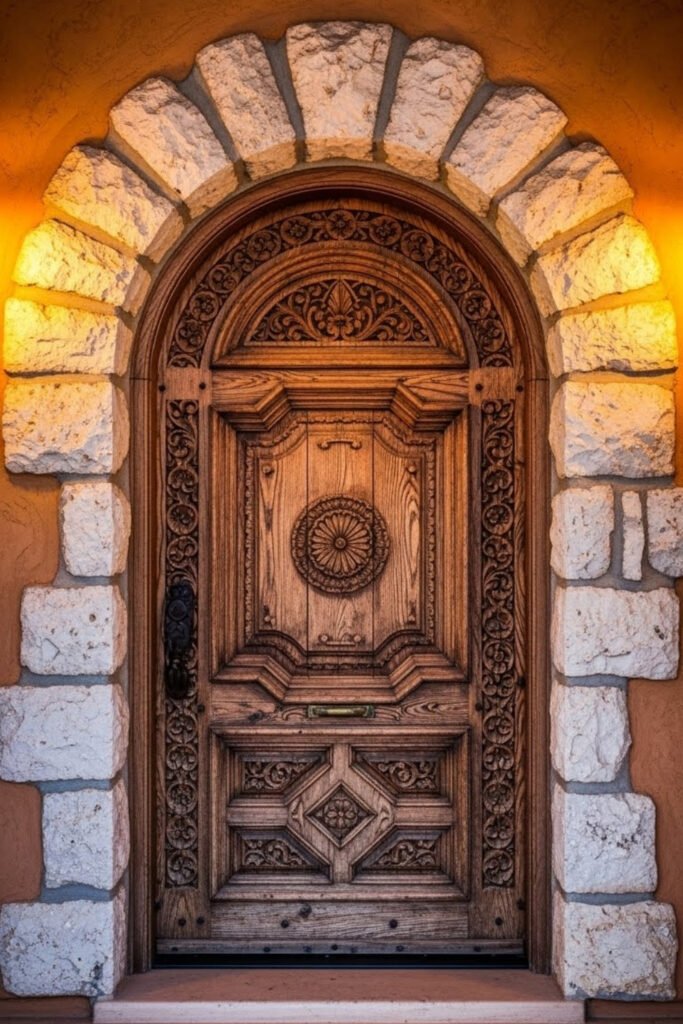 Carved wooden doors create a strong first impression in Mediterranean homes. Detailed craftsmanship adds character without relying on color or extra decoration.