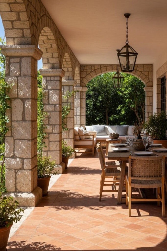 An open loggia acts as a covered outdoor living space that stays shaded yet connected to nature. It’s perfect for dining, lounging, or transitioning between indoors and outdoors.