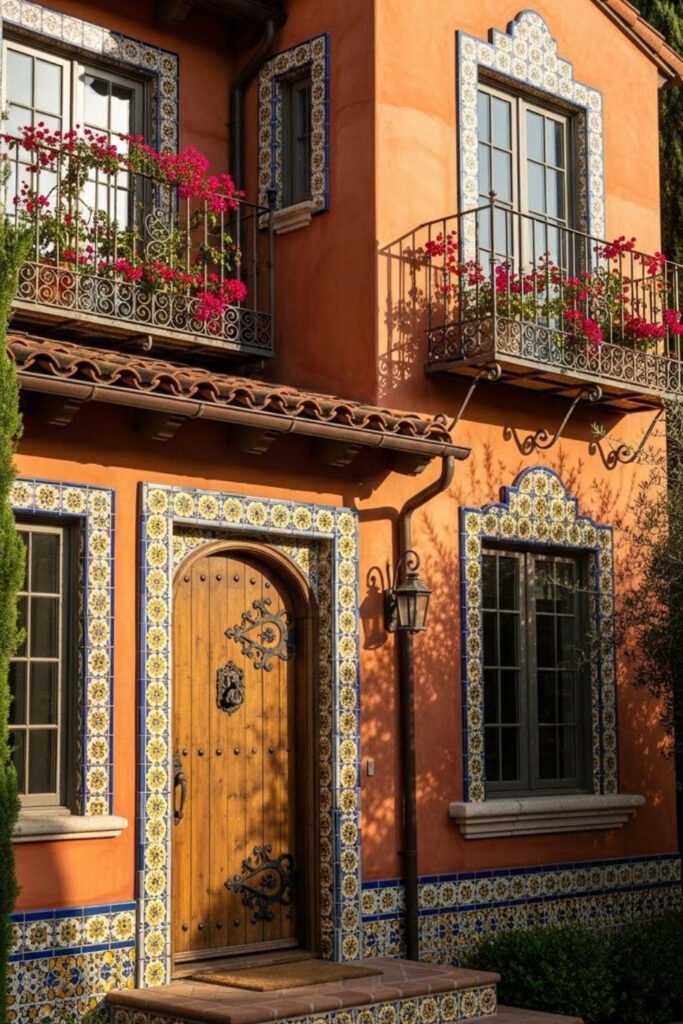 Spanish fusion Mediterranean homes blend warm stucco walls with tiled details and bold wooden elements. This style often includes decorative tiles around doors or stair risers.