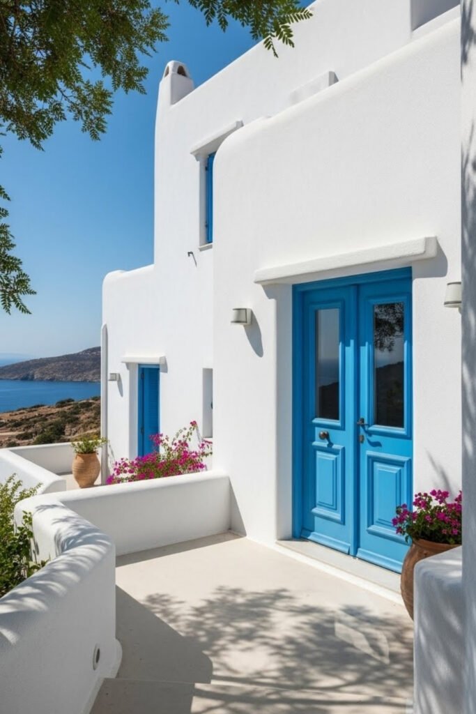 Greek-inspired Mediterranean homes use clean lines, white walls, and minimal detailing. This approach keeps the exterior bright and reflective in sunny climates.