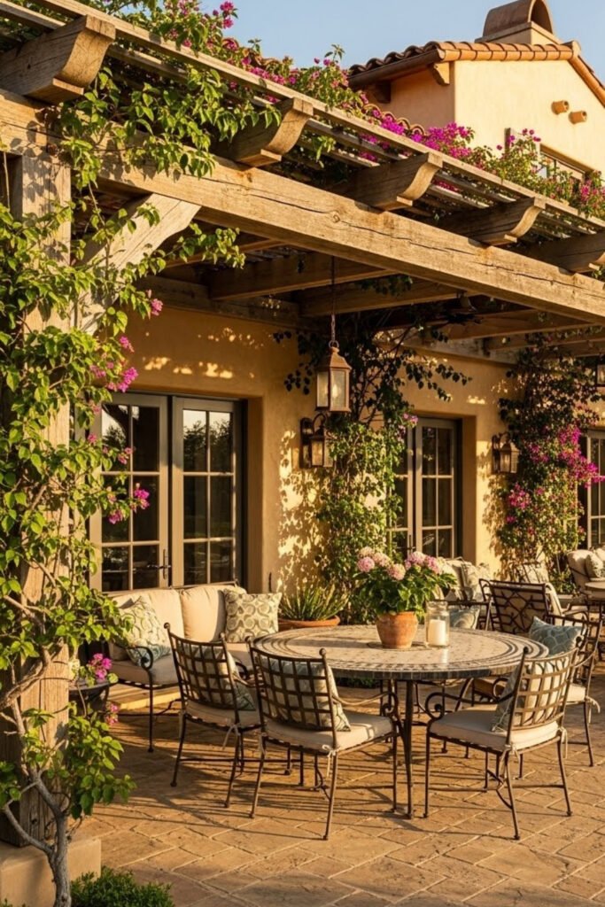 Wooden beams paired with climbing vines create a natural cooling effect. This idea enhances outdoor use without fully enclosing the space, keeping the home open and breathable.
