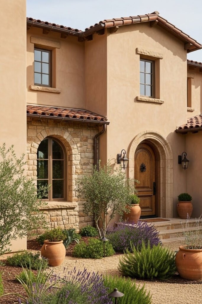 Earth-toned exteriors keep Mediterranean homes grounded and timeless. Colors like sand, clay, and soft beige blend naturally with stone and tile materials.