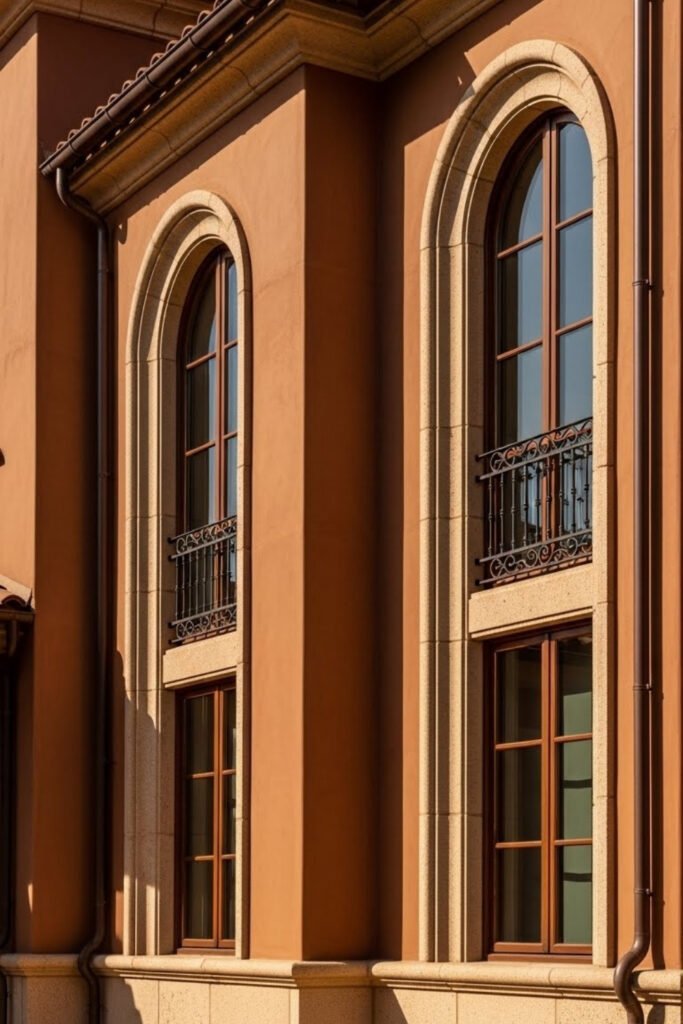 Simple curved or linear iron designs feel timeless and don’t overpower the facade. Paired with arched doors or tall windows, balconies create a strong indoor-outdoor connection.