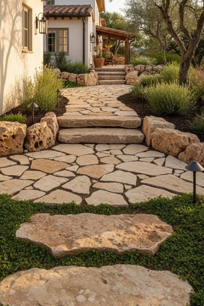 Stone walkways guide movement while reinforcing the Mediterranean look. Natural, irregular stones feel more authentic than perfectly cut pavers.