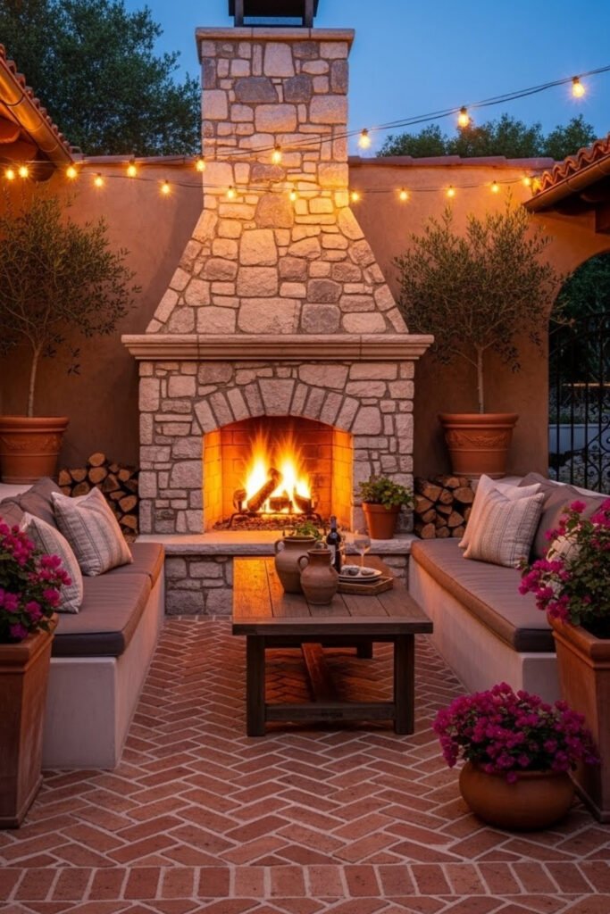 An outdoor fireplace extends the usability of Mediterranean homes into cooler evenings. Built from stone or stucco, it becomes a strong focal point for patios or courtyards.